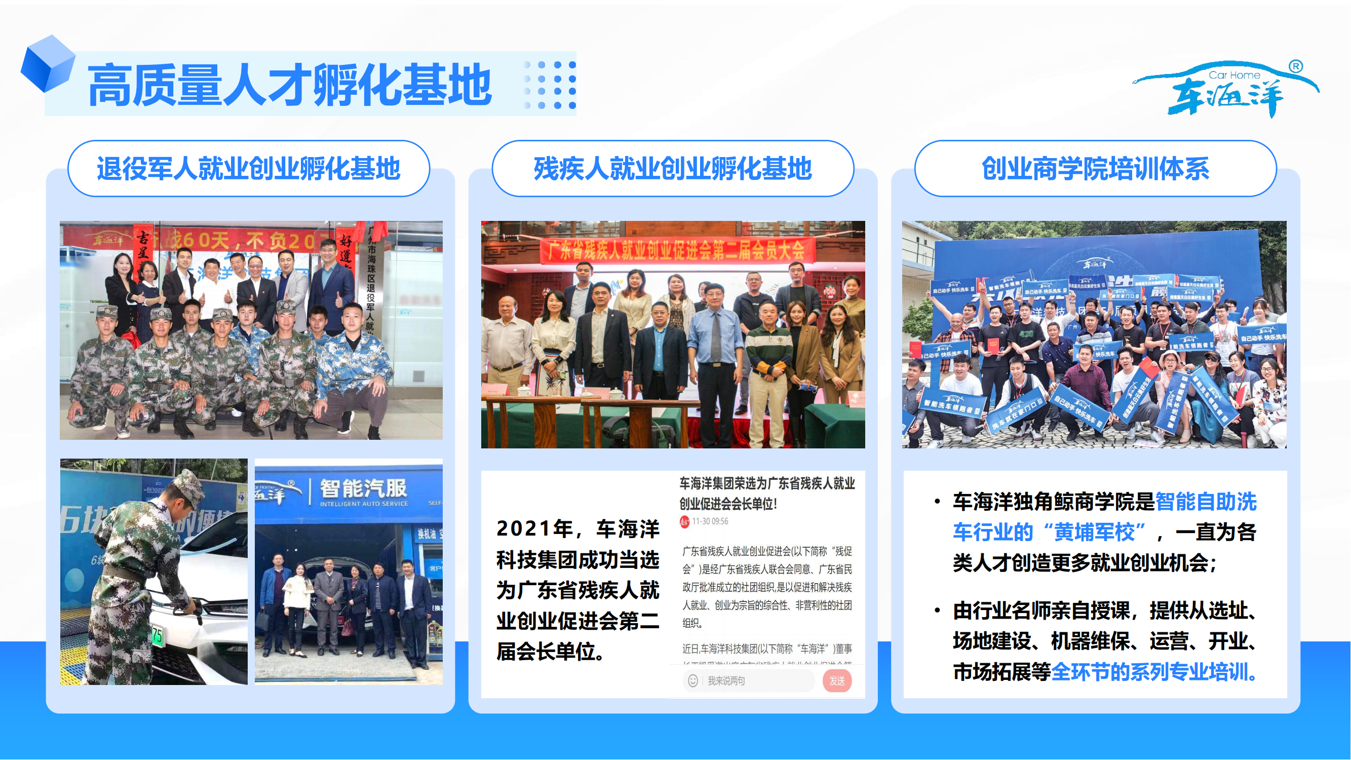 車海洋積極發(fā)揮民營(yíng)企業(yè)在穩(wěn)企就業(yè)、促增收中的重要作用,合作建立退役軍人、殘疾人就業(yè)創(chuàng)業(yè)孵化基地,創(chuàng)造就業(yè)機(jī)會(huì)。建立了企業(yè)內(nèi)部人才商學(xué)院,打造數(shù)百名精英人才,成為創(chuàng)新高績(jī)效的人才組織。