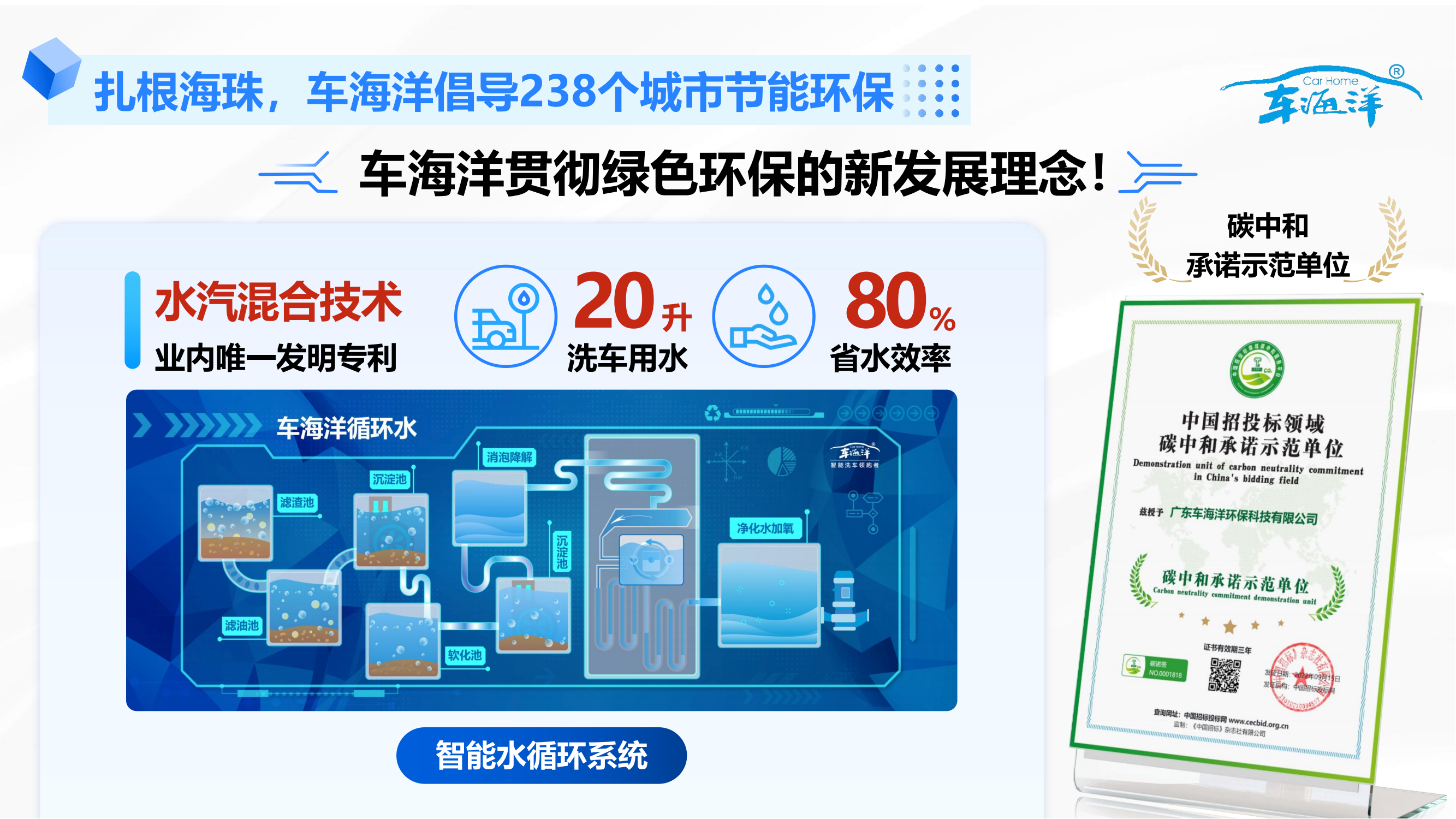 作為“碳中和承諾示范單位”,車海洋堅(jiān)持使用環(huán)保無(wú)污染的洗車液,將洗車廢水循環(huán)利用,降低洗車用水排放量50%以上,每洗一輛車可比傳統(tǒng)人工洗車節(jié)水70-80%,為國(guó)家省下了268個(gè)西湖的儲(chǔ)水量!