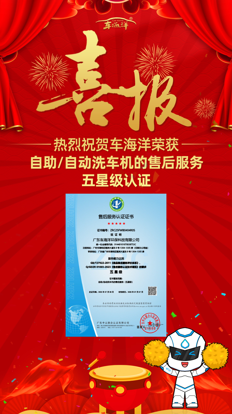 熱烈祝賀車海洋榮獲“自助/自動洗車機售后服務五星級”證書