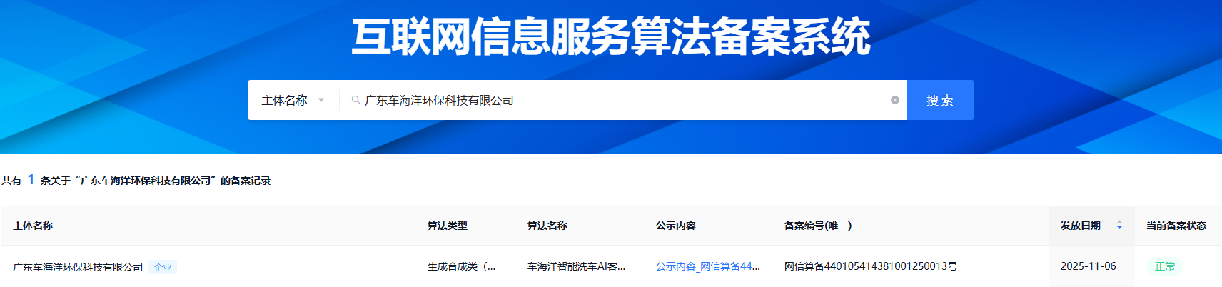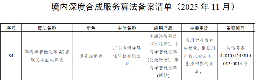 2025年11月,中華人民共和國(guó)國(guó)家互聯(lián)網(wǎng)信息辦公室(以下簡(jiǎn)稱:國(guó)家網(wǎng)信辦)第十四批深度合成服務(wù)算法備案名單正式公布,廣東車海洋環(huán)??萍脊荆ㄒ韵潞?jiǎn)稱:車海洋)自主研發(fā)的車海洋智能洗車AI客服文本生成算法赫然在列。